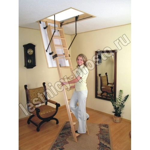 Лестница раздвижная двухсекционная, изготовлена из сосны. Термоизоляционная крышка типа "сэндвич" имеет усиленную теплозащиту, облицована с двух сторон ДСП белого цвета. По контуру короба имеется уплотнитель. Все металлические элементы лестницы покрыты порошковой краской, ступени лестницы имеют антискользящие насечки и закреплены в столярное соединение «ласточкин хвост», что позволяет выдерживать нагрузку 150 кг. При раскладывании лестницы нет вылета за пределы короба, что позволяет использовать эту модель лестницы в таких помещениях, где невозможно использовать чердачные лестницы с большим разбегом открытия. Удобна для эксплуатации на большой высоте. Деревянный стержень для открывания лестницы в комплекте..