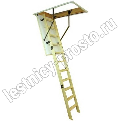 Лестница складная трёхсекционная, изготовлена из сосны. Термоизоляционная крышка типа "сэндвич" утеплена пенопластом, облицована с двух сторон ДСП белого цвета. Короб люка с однослойным уплотнителем. Все металлические элементы лестницы покрыты порошковой краской, ступени лестницы имеют антискользящие насечки и закреплены в столярное соединение «ласточкин хвост», что позволяет выдерживать нагрузку до 150 кг. Деревянный стержень для открывания лестницы в комплекте.