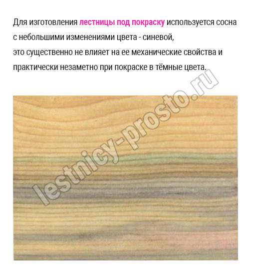 Для изготовления лестницы из сосны ПОД ПОКРАСКУ используется сосна с небольшим дефектом цвета - потемнениями и синевой, которые никак не влияют на механические свойства древесины и мало заметны при покраске в тёмные цвета.