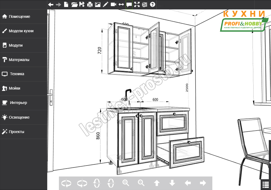 Благодаря модульной системе такая кухня может быть собрана зеркально, а, например, верхние шкафчики "под стекло" и "глухие" заменены местами. В стандартной комплектации нижние тумбы оснащены регулируемыми ножками высотой 100 мм и цоколем из массива сосны высотой 95 мм.