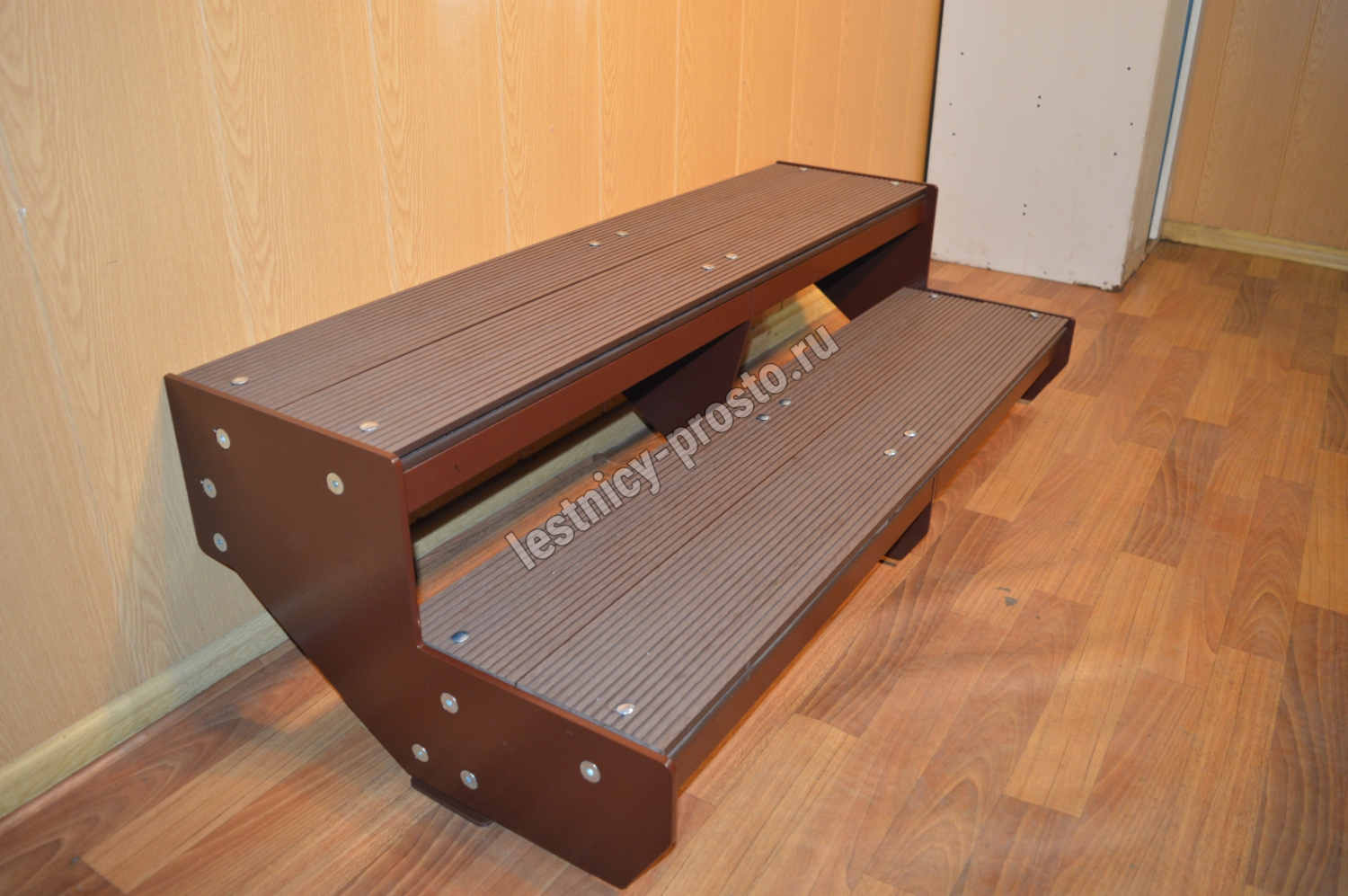 Ступени лестницы состоят из металлической рамки, обеспечивающей необходимую прочность, и покрытия из террасной доски ДПК (древесно-полимерный композит). Ступени не боятся воды и мороза, не теряют со временем свой внешний вид и не требуют ухода.