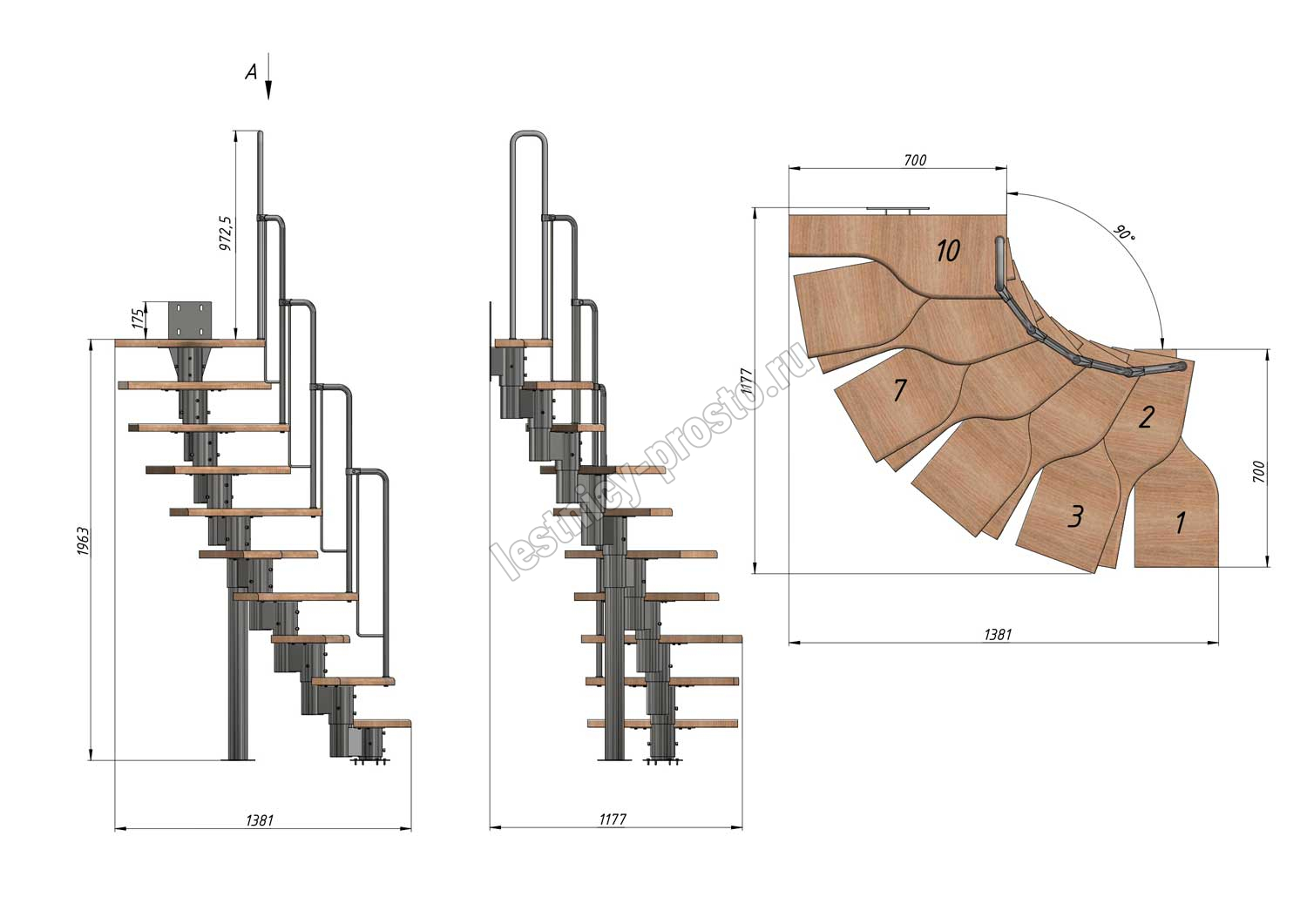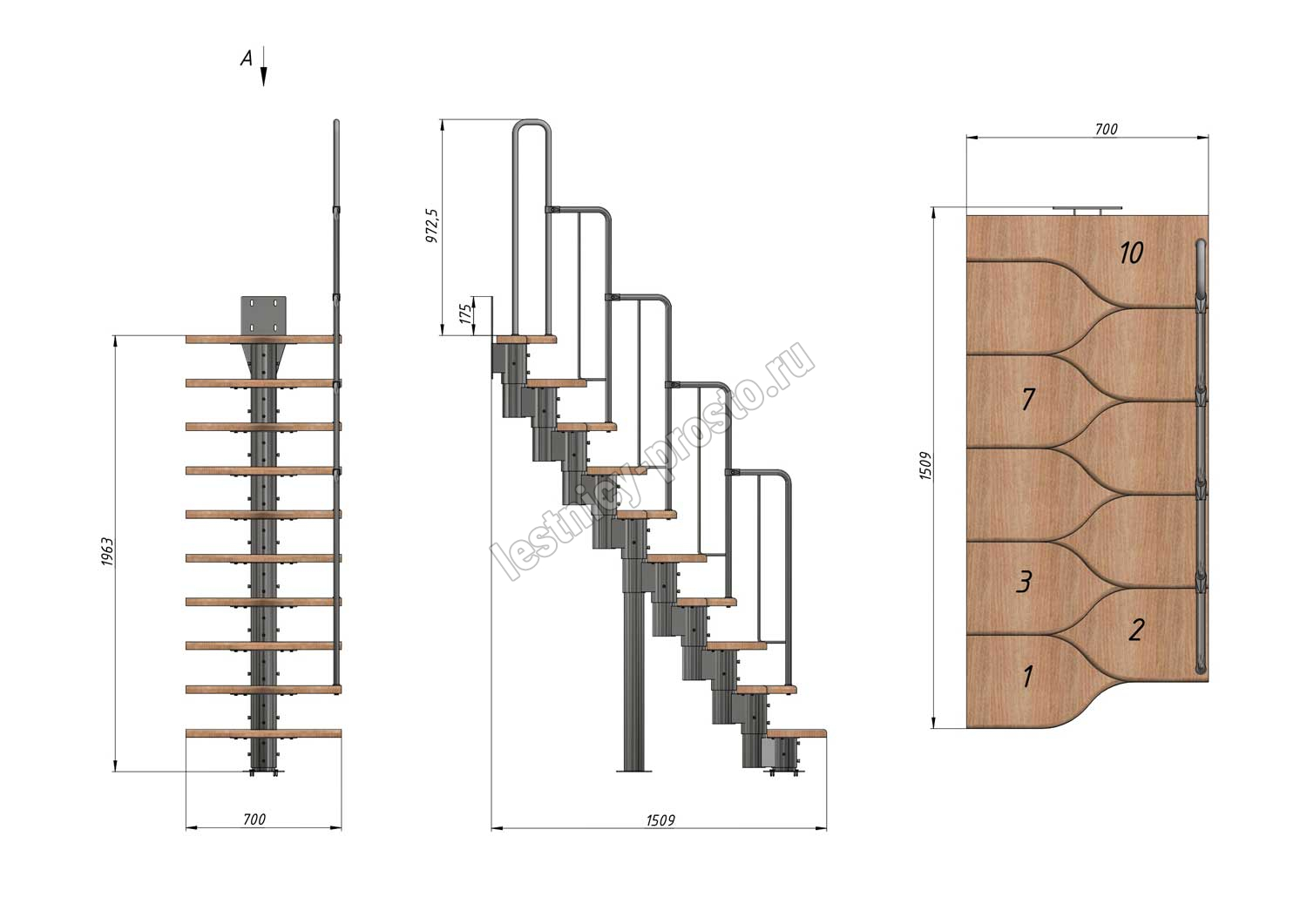Лестница Prosto Urban Black гусиный шаг 700 мм, h180-264 см (10 ступеней), ясень