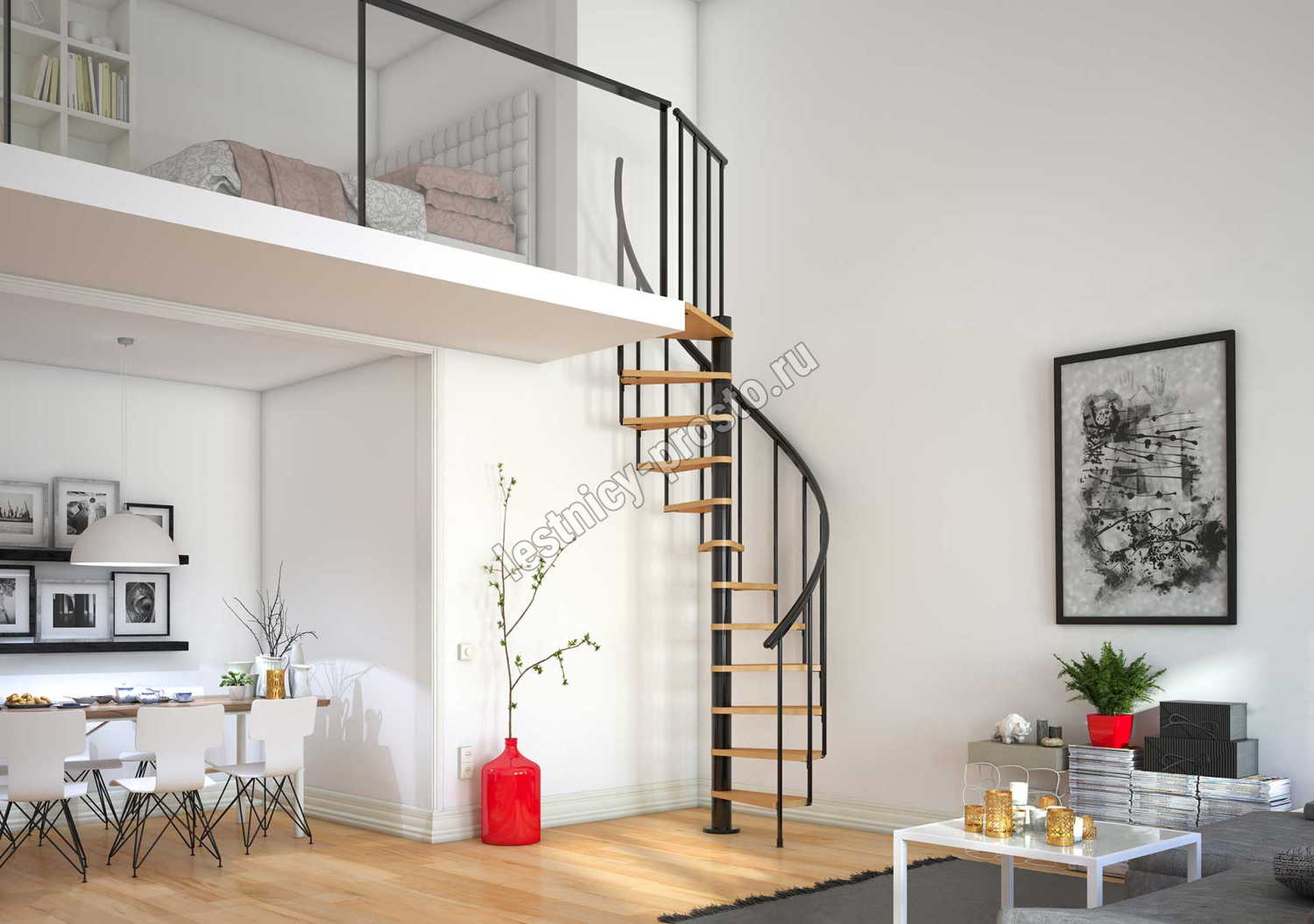 Ступени лестницы изготовлены из бука по технологии MULTIPLEX и покрыты износостойким защитным лаком. Лестница монтируется как по часовой стрелке, так и против. Возможен монтаж в круглый или квадратный проём. Ограждение: стальные трубки, Ø25 мм RAL 7016. Поручень: гибкий цельный ПВХ-поручень Ø40 мм антрацитового цвета. Конструкция и балюстрада окрашены порошковым способом в антрацитовый цвет (RAL 7016).